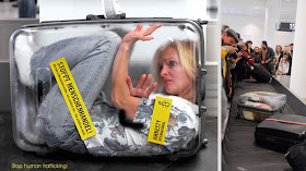 A real, living woman was forced in a crystal suitcase and afterwards put on a running baggage claims at various airports.